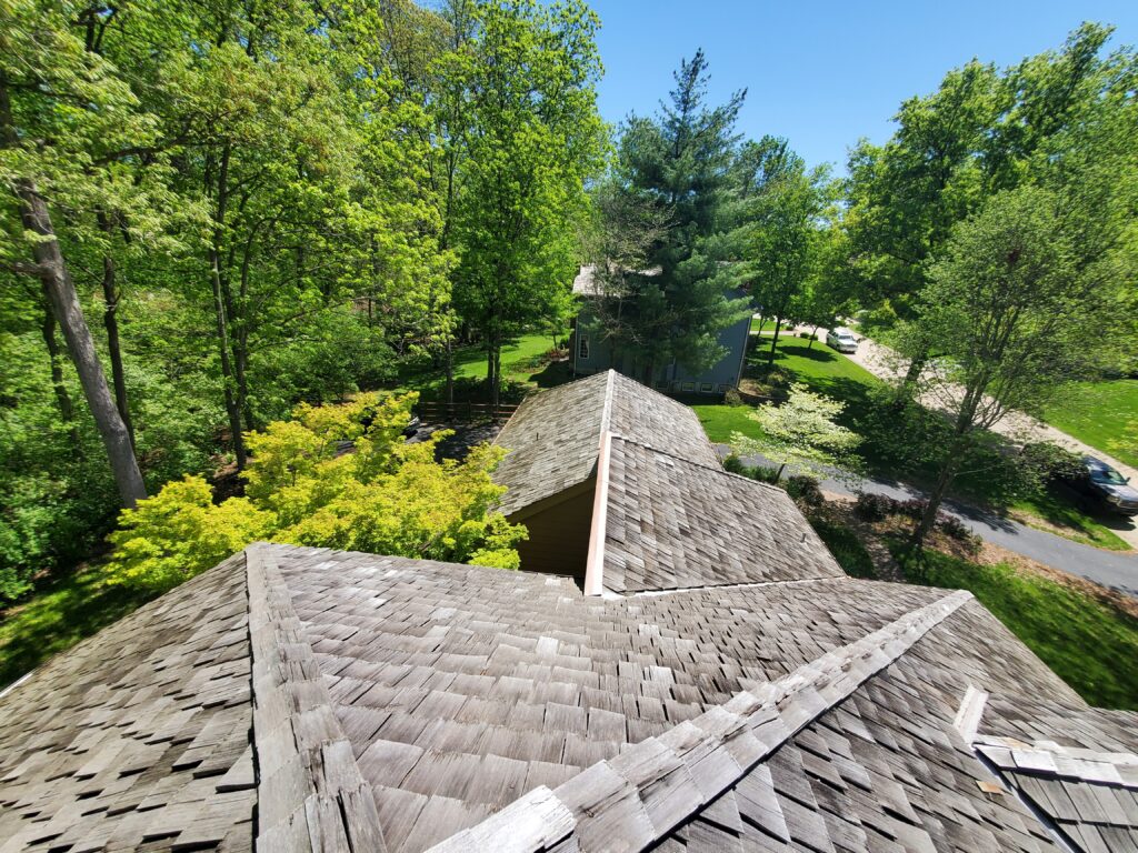 Plan: Full tear-off and deck inspection, new underlayment with ice & water shield, proper bath fan vent, balanced ventilation (intake + ridge), and new step/counter-flashing at the chimney.